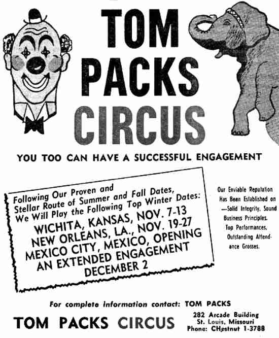 Packs saw a potential in circuses and in 1937 presented his first "Tom Packs Circus. The circuses showed in ball parks and arenas, and buildings, at first in the mid west but soon covered the east. In 1956 Packs started a second unit to operate on the west coast, the circus also operated in Cuba before Castro's revolution.