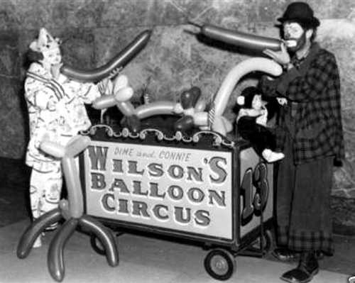The Wilson family have been in the circus business for many generations. Dime was born on a circus train as it passed near Detroit, Mi. In early years Dime did trapeze, trampolin and animal acts before developing his famous "hobo" clown character. Connie Doile began her circus career as an aerialist on her uncle's circus. Connie continued her aerial artisty until after a bad fall, her husband Dime convinced her to keep her feet on the ground. That is when she became Dime's "white face"clown partner "Willie".
