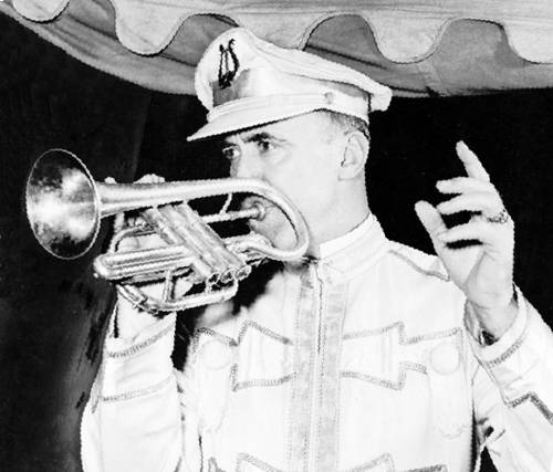 Merle Slease Evans was born December 26, 1891 in Columbus, Kansas in 1891 to parents John L. and Sarah Elisabeth (Stoddard) Evans. Before Merle's birth, john and Sarah moved from Paducah, Kentucky. to Columbus where Merle's father found work as foreman in a coal mine. In his early years, young Merle was very ambitious and worked hard at many jobs. He shined shoes at the local barber shop, worked at a greenhouse, drove a delivery wagon, set type at a printing shop, worked as a bell hop, ran a paper route and sold newspapers on a street corner. Watching his sister play the family's piano, Evans took an early interest in music. The city of Columbus had a band which became one of the best bands in the midwest. The city band often traveled and gave concerts a various city. Evans loved the band and spent much of his time watching the band practice at the city's firehouse. When the Columbus band formed a boys band, Merle was the first to sign up. The band needed a alto horn and one was ordered on for Evans, however the order was confused and a cornet arrived instead. Every free moment Merle had he would practice and soon he graduated to the adult band. In 1909 the S. W. Brundage Carnival showed at the city's annual "Old Settlers Reunion". The carnival carried a large band and hired Evans as a cornet player, at $10.00 per week. Before the carnival's season had ended, Merle had taken over the position of band leader. In 1910 Merle received a telegram from his friend Cleve Pullen inviting him to join Pullen in the band aboard the Cotton Blossom Showboat. Evans left the Brundage show and joined the showboat in Paducah, Ky. Merle enjoyed the easy life aboard the slow moving showboat. Moving between towns along the Mississippi River gave him many hours to practice on his cornet. After the riverboat Evans and Pullen took out a small repertoire show, then Merle worked with various "rep shows", comedy companies, medicine shows and in 1915 again with the Brundage carnival. After the close of the Brundage carnival's season, Merle sent a letter to the Miller Bros 101 Ranch Wild West Show, requesting the position of band leader of the show. Merle was accepted and asked to form an eighteen piece band. After the close of the Millers Bros' season Merle again worked at various jobs including operating a "Spidora" illusion show with the Brundage carnival. In 1918 Evans was working with Gus Hill's Minstrel show in Cincinnati Ohio. Charlie Wilson, the train master with the Ringling Brothers Circus happened to visit the show. Merle and Wilson had a short conversation, in which Evans mention that if a position on the circus was available please let him know. In December of 1918 Merle received an unexpected telegram from Mr. Charles Edward Ringling, requesting Evans to join the newly combined Ringling Brothers and Barnum and Bailey Circus as it's band leader for the 1919 season. Nothing could have excited the 27 year old Evans more than to be offered the position of band leader with the "Greatest Show on Earth, a position he would hold for the next fifty years. On March 29, 1919 opened with the RBBB circus in Madison Square Garden in New York City. Merle Evans became the greatest and best known circus musician of all times. During his long career on the RBBB, Evans witnessed many historical events including the great depression, Ringling managerial changes, the labor union strikes which closed the show mid-season in 1938. Perhaps the most memorable and gravest occurred on July 6, 1944. On July 6, 1944,the Ringling Brothers and Barnum and Bailey Circus was showing in Hartford, Connecticut. During the afternoon performance fire broke out near the top of the circus' big top and spread rapidly. The crowd panicked and rushed towards the main entrance. The circus band led by Evans at great risk to themselves continued to play in an effort to calm the crowd into a more orderly and safer exit from the ongoing inferno. The band continued playing as the burning tent collapsed around them until a "quarter pole" fell through the bandstand forcing them out, the band reformed outside and began playing again. Tragically 169 people died on that day, however the number would have been much greater had not the band played on. Evans and his band are remembered heroically for their actions and bravery. You can read more about the tragedy at this link: Hartford Circus Fire. During Evans' career he wrote 8 circus marches, performed concerts in the United States and Europe, and made many records. several books have been written about his life and career. On November 30, 1969, Merle played his last performance with the Ringling Brothers and Barnum and Bailey Circus and retired to his home in Sarasota Florida. Evans remained active in his retirement, serving as a director of the Columbus State Bank in Columbus, Kansas, conducting music workshops, making personal appearances and leading bands across the country. On December 31, 1987 Merle Slease Evans died at his home in Sarasota.